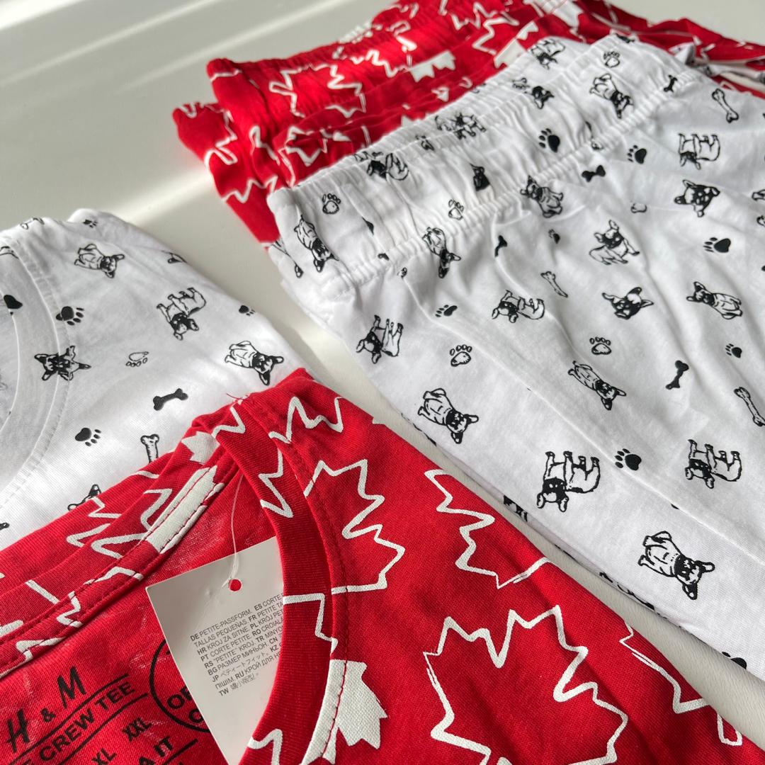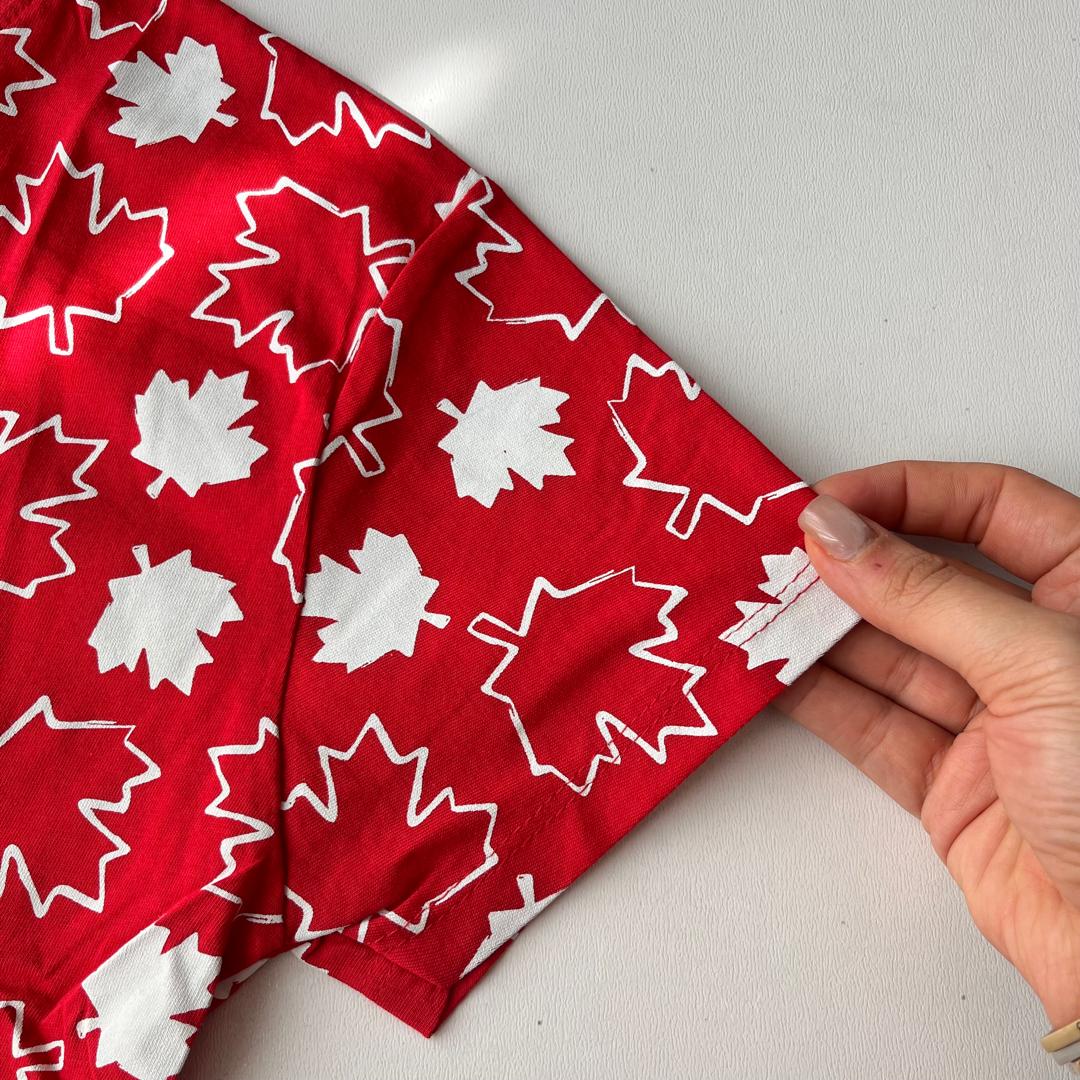 طرح برگ سفید زمینه قرمز:عرض تیشرت بدون کشسانی 48 سانت، عرض ران بدون کشسانی 27 سانت
